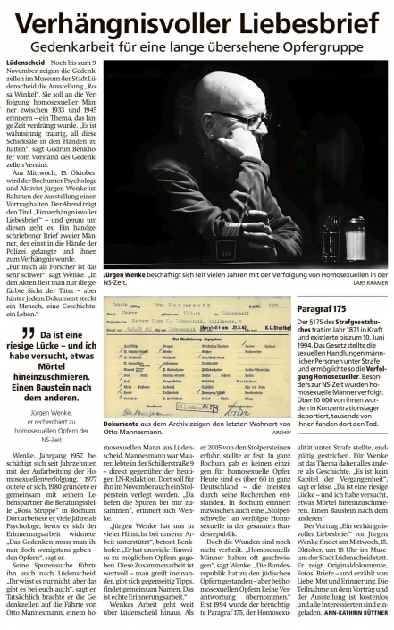 Die nationalsozialistische Diktatur stempelte homosexuelle Männer als sogenante „Volksfeinde“ ab. Was das konkret bedeutete und welche Auswirkungen es auf diese Männer hatte, schildert der Forscher und Psychologe Jürgen Wenke in einem Bildvortrag mit Fotos, Bildern und zahlreichen Originaldokumenten aus der NS-Zeit. Ein aufbewahrter Liebesbrief wird sowohl dem Empfänger (26) als auch dem Schreiber (32) zum folgenreichen Verhängnis. Die Lebenswege der beiden Männer und die Auswirkungen der Verfolgung auf sie, ihre Herkunftsfamilien und die gesellschaftlichen Auswirkungen sowie positive Beispiele von Erinnerungskultur sind Teile des Vortrages.