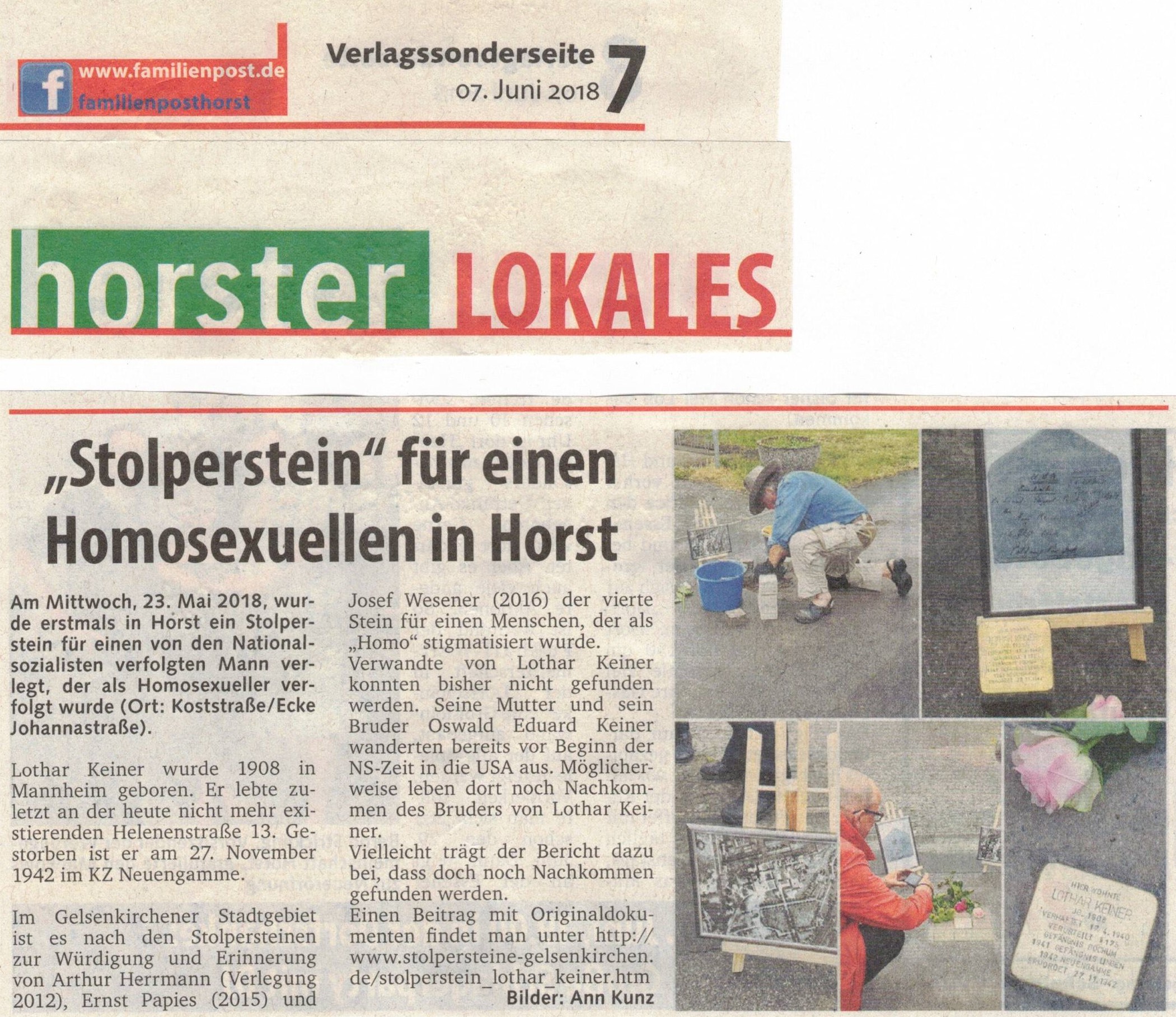 Am 23. Mai 2018 wurde in Gelsenkirchen-Horst, (Koststraße/Ecke Johannastraße) zur Erinnerung an und Würdigung von Lothar Keiner ein Stolperstein verlegt. Der Künstler Gunter Demnig verlegte den Stein persönlich.